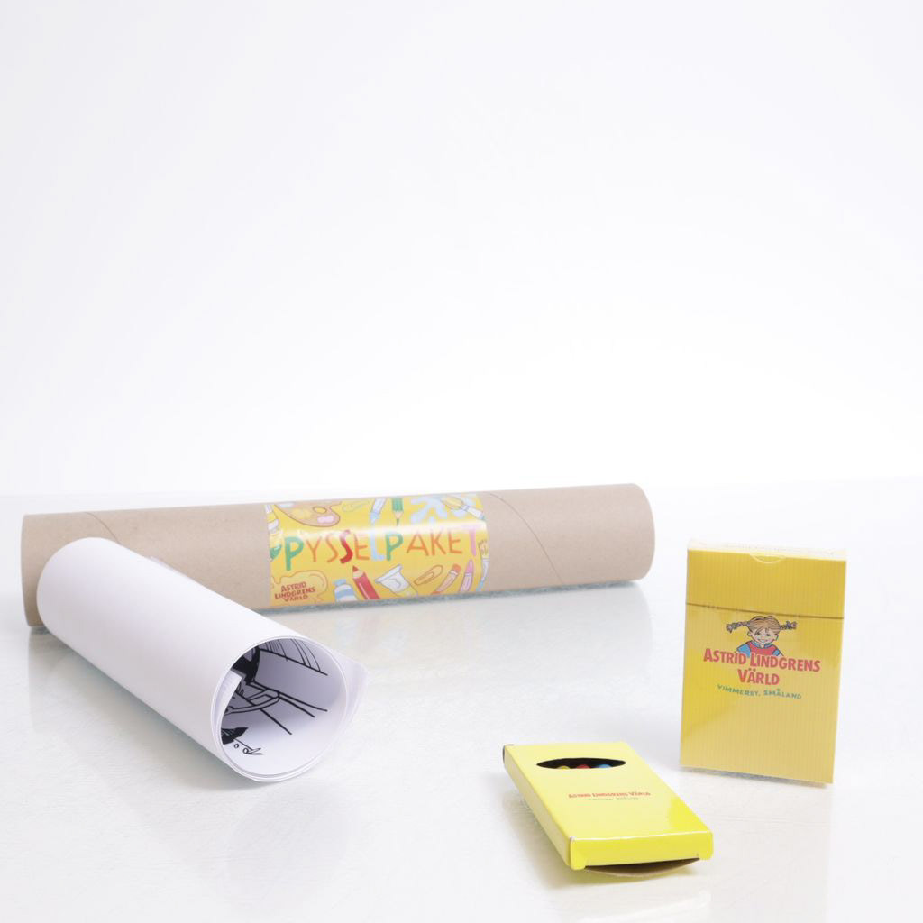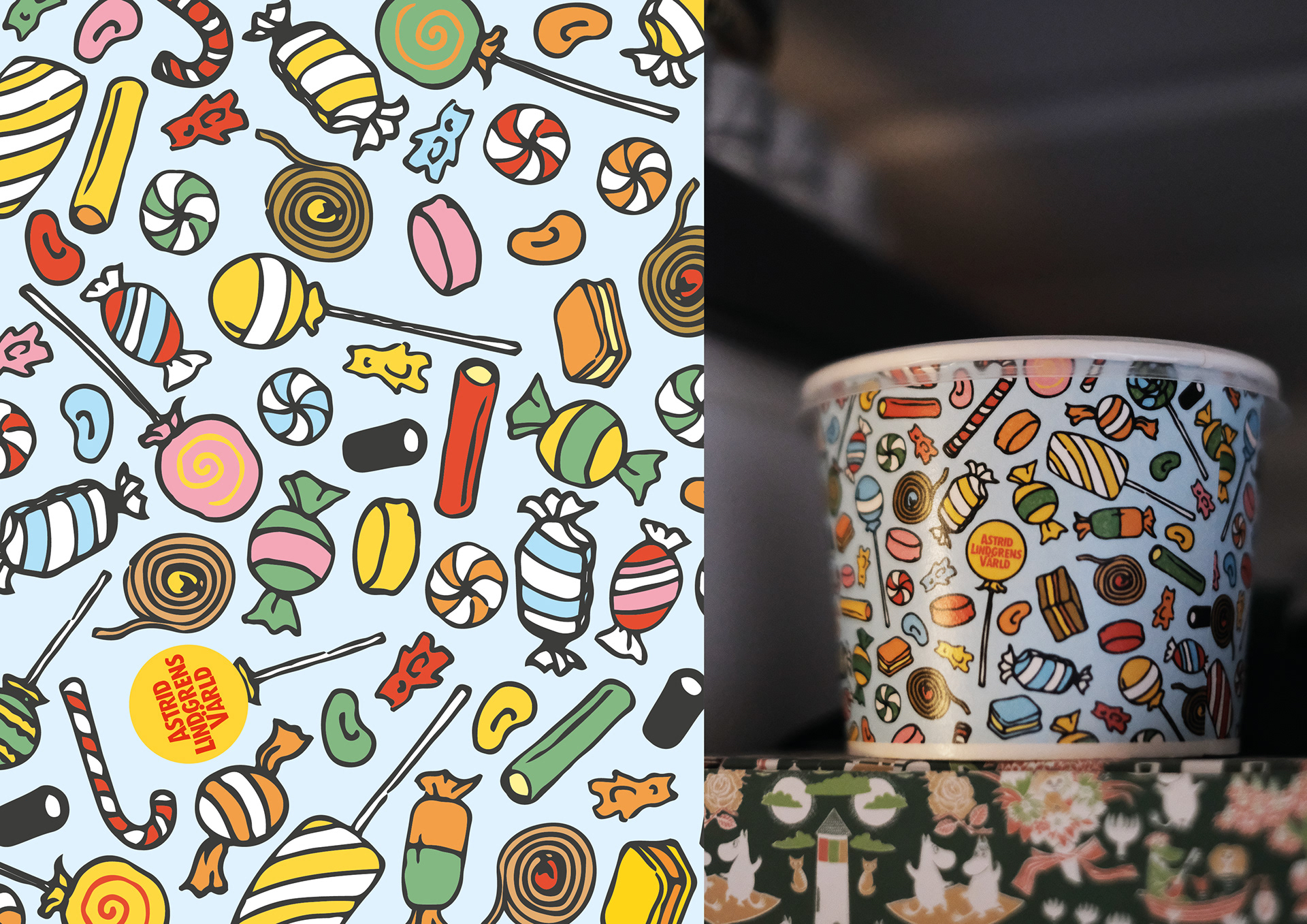 På uppdrag av Astrid Lindgrens Vimmerby AB tog jag fram ett mönster till deras godisburkar samt pysselpaket.