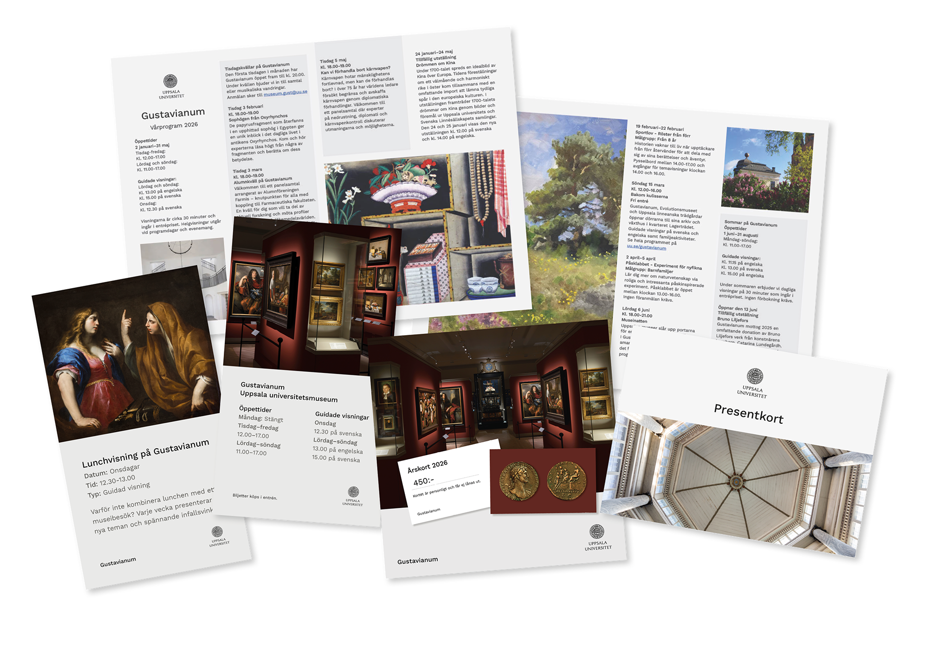 Diverse annonsmaterial, formgivet på uppdrag av Gustavianum, Uppsala universitet.